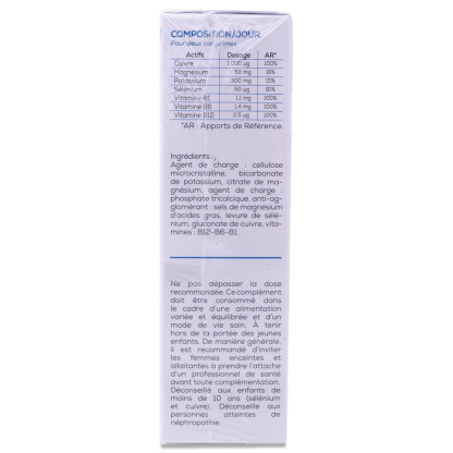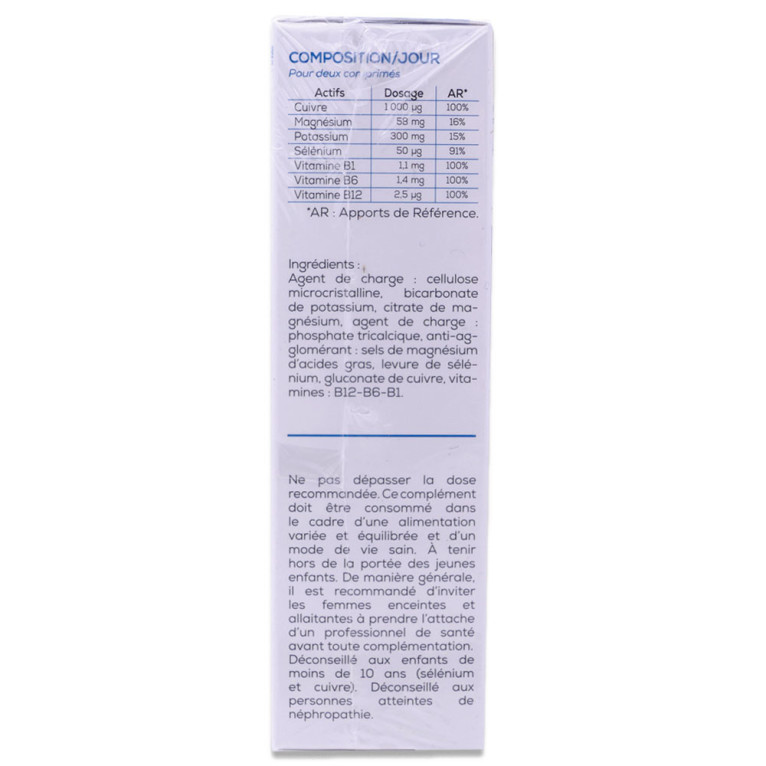 Le magnésium et le cuivre, ingrédients principaux de ce complément alimentaire, jouent un rôle essentiel dans le maintien d'une fonction musculaire normale et la protection des cellules contre le stress oxydatif. Il contient également du sélénium qui s'associe au cuire pour contribuer également à la protection des cellules contre le stress oxydatif. Ce complément alimentaire contient également du potassium et des vitamines B. Chaque boîte contient 60 comprimés, soit un programme d'un mois, conçu pour accompagner votre routine quotidienne.