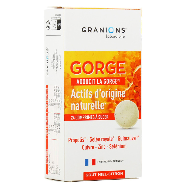 Ils contiennent de l'extrait de propolis, de la gelée royale, de la guimauve et des minéraux. Leur formule unique permet une action rapide et efficace : la guimauve est reconnue pour ses propriétés apaisantes sur la gorge afin de l'adoucir. La propolis et la gelée royale que les abeilles produisent dans leur ruche, sont riches en nutriments essentiels pour l'organisme. Le sélénium, le zinc et le cuivre complètent la formule. En plus de leur efficacité, les comprimés Granions Gorge sont agréables à prendre grâce à leur goût miel citron. Ils conviennent à toute la famille (à partir de 6 ans). N'attendez plus pour vous procurer ce produit de qualité sur notre site de vente en ligne à prix discount.