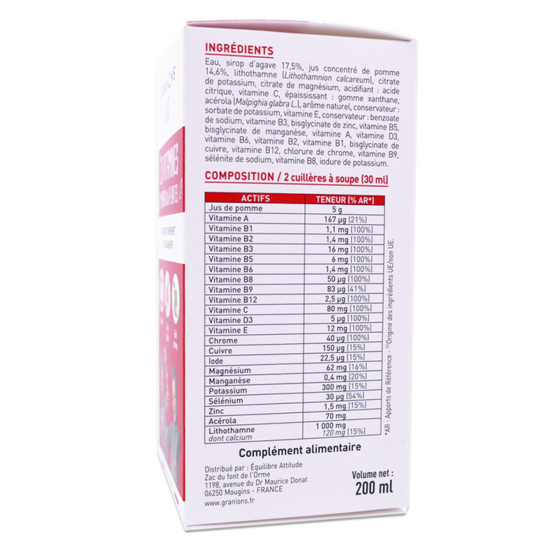 Eau, sirop d’agave (17,5%), jus concentré de pomme (5 g), lithothamne (Lithothamnion calcareum - 1 000 mg dont calcium : 120 mg - 15%*), citrate de potassium (dont potassium : 300 mg - 15%*), citrate de magnésium (dont magnésium : 62 mg - 16%*), acidifiant : acide citrique, vitamine C (80 mg - 100%*), épaississant : gomme xanthane, acérola (Malpighia glabra L. - 70 mg), arôme naturel (épaississant : gomme xanthane), conservateur : sorbate de potassium, vitamine E (12 mg - 100%*), conservateur : benzoate de sodium, vitamine B3 (16 mg - 100%*), bisglycinate de zinc (dont zinc : 1,5 mg - 15%* ; épaississant : carboxyméthyl-cellulose sodique, acidifiant : ascorbate de sodium), vitamine B5 (6 mg - 100%*), vitamine A (400 µg - 50%* ; huile de maïs, acidifiant : alpha tocophérol, épaississant : gomme arabique, saccharose, anti-oxydant : ascorbate de sodium), bisglycinate de manganèse (dont manganèse : 0,4 mg - 20%* ; acidifiant : acide citrique), vitamine D3 (5 µg - 100%* ; acidifiant : alpha tocophérol, anti-oxydant : ascorbate de sodium, saccharose), vitamine B6 (1,4 mg - 100%*), vitamine B2 (1,4 mg - 100%*), vitamine B1 (1,1 mg - 100%*), bisglycinate de cuivre (dont cuivre : 150 µg - 15%* ; acidifiant : acide citrique), vitamine B12 (2,5 µg - 100%*), vitamine B9 (200 µg - 100%*), chlorure de chrome (dont chrome : 40 µg - 100%*), sélénite de sodium (dont sélénium : 50 µg - 91%*), vitamine B8 (50 µg - 100%*), iodure de potassium (dont iode : 23 µg - 15%*). *AR : Apports de Référence