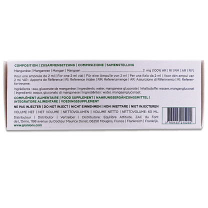 Ce produit contient du manganèse, un oligo-élément essentiel qui contribue à la protection des cellules contre le stress oxydatif et participe au maintien d'une ossature normale. Le manganèse soutient également le métabolisme énergétique normal. Chaque ampoule est formulée pour offrir une dose précise de 2 mg de manganèse, assurant ainsi une absorption optimale. Les produits Granions sont élaborés avec soin pour garantir efficacité et sécurité, en respectant les normes européennes en vigueur.