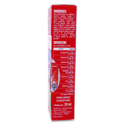 Sans colorant, sans arôme artificiel, sans lactose, saans gluten. Sirop d’agave (46%), eau, stabilisant : glycérine végétale, vitamine C, arôme naturel mangue (stabilisant : gomme arabique, anti-oxydant : alpha tocophérols), arôme naturel de fruits exotiques, arôme naturel pêche (stabilisant : gomme arabique, support : sirop de glucose déshydraté), bisglycinate de zinc (acidifiant : acide citrique), sélénite de sodium, vitamines : B3 - B12 - B6 - B2, conservateurs : sorbate de potassium - benzoate de sodium, vitamine B9, iodure de potassium.