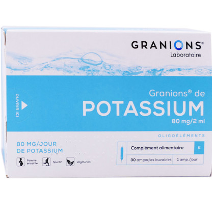 GRANIONS POTASSIUM 30 AMPOULES en vente en ligne sur le site de votre parapharmacie à prix discount. Un complément alimentaire à base de potassium, à consommer lors de crampes ou faiblesses musculaires.