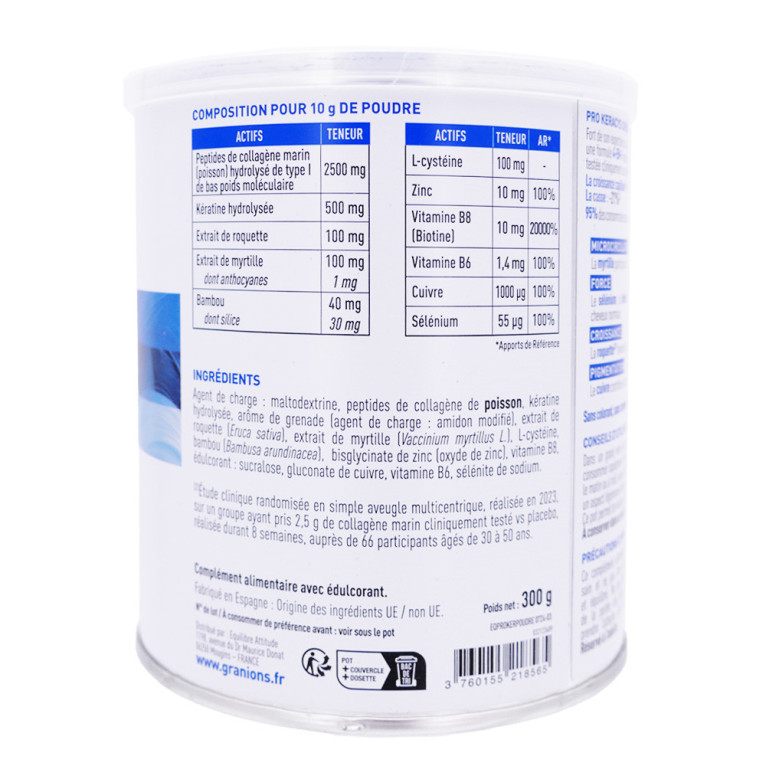 Ingrédients : Agent de charge : maltodextrine, peptides de collagène de poisson, kératine hydrolysée, arôme de grenade (agent de charge : amidon modifié)Agent De Charge : Maltodextrine, Peptides De Collagène De Poisson, Kératine Hydrolysée, Arôme De Grenade (Agent De Charge : Amidon Modifié), Extrait De Roquette (Eruca Sativa), Extrait De Myrtille (Vaccinium Myrtillus L.), L-Cystéine, Bambou (Bambusa Arundinacea), Bisglycinate De Zinc (Oxyde De Zinc), Vitamine B8, Édulcorant : Sucralose, Gluconate De Cuivre, Vitamine B6, Sélénite De Sodium.