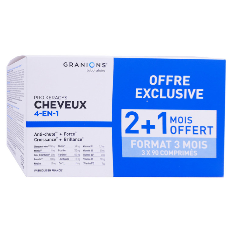 GRANIONS PRO KERACYS CHEVEUX 4 EN 1 FORMAT 3 MOIS 3X90 COMPRIMES est en vente en ligne sur le site de votre parapharmacie à prix discount.