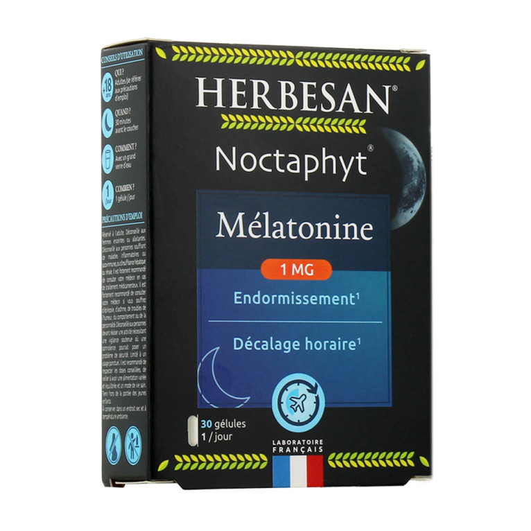 HERBESAN NOCTAPHYT MÉLATONINE 1MG 30 GÉLULES en vente en ligne, sur le site de votre parapharmacie à prix discount, est un complément alimentaire contenant de la mélatonine qui favorise un sommeil de qualité.