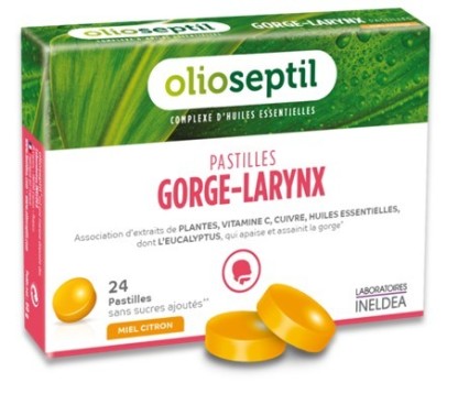 OLIOSEPTIL GORGE-LARYNX est un complément alimentaire sous forme de pastilles goût miel eucalyptus, conçues à partir d’Eucalyptus qui apaise et assainit la gorge. La formule est complétée par des extraits de Thym, Mauve et Sauge ayant un effet bénéfique sur le pharynx et les cordes vocales : L’extrait de Mauve soulage les irritations de la gorge tandis que l’extrait de Sauge agit favorablement sur les enrouements. L’extrait de Thym aide à combattre les refroidissements et apaise les voies respiratoires. S’ajoute à OLIOSEPTIL GORGE-LARYNX du cuivre et de la vitamine C participant ensemble au fonctionnement optimal du système immunitaire.