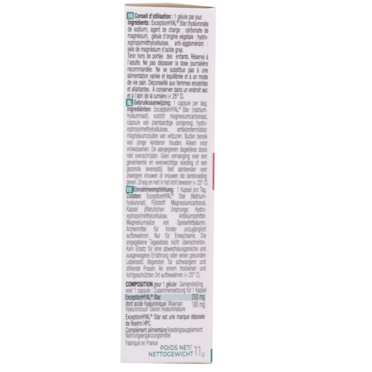 IComplément alimentaire à base d'acide hyaluroniqueIngrédients : ExceptionHYAL® Star (hyaluronate de sodium), agent de charge : carbonate de magnésium, gélule d'origine végétale : hydroxypropylméthylcellulose, anti-agglomérant : sels de magnésium d'acide gras.Actifs pour 1 gélule Acide hyaluronique ULTRA : ExceptionHYAL® Star : 200 mg, dont acide hyaluronique : 180 mg.