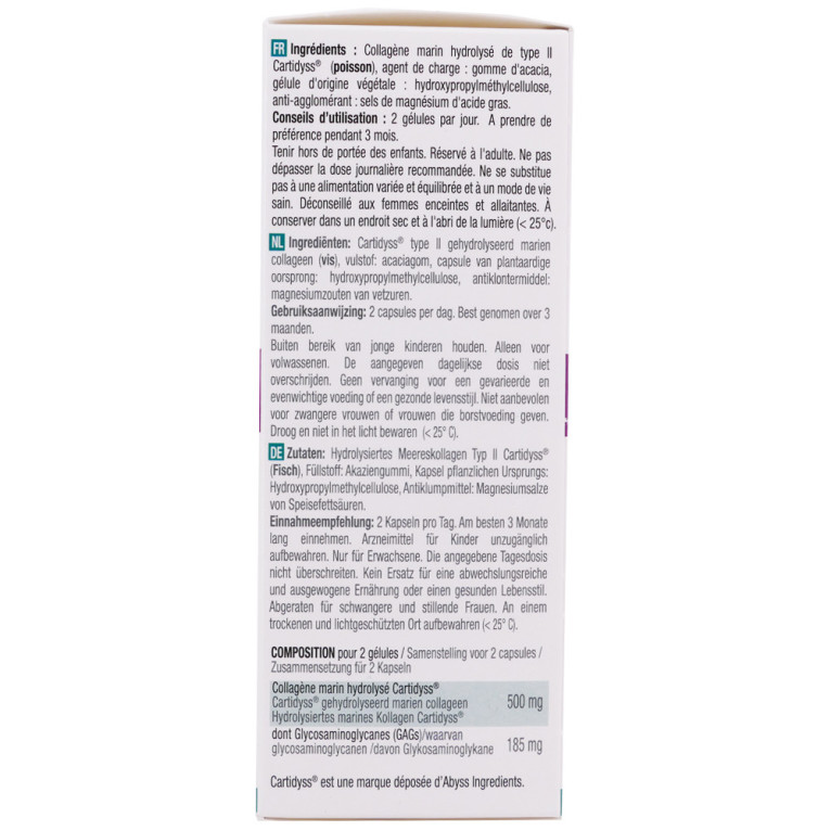 Ingrédients : Collagène marin hydrolysé de type ll Cartidyss® (poisson), agent de charge : gomme d'acacia, gélule d'origine végétale : hydroxypropylméthylcellulose, anti-agglomérant : sels de magnésium d'acide gras.
