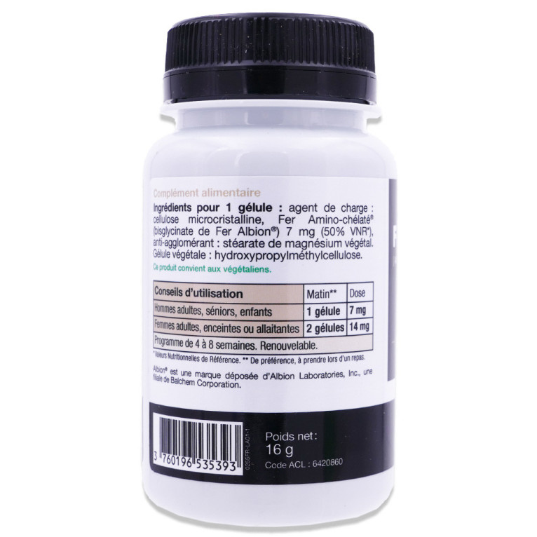 Composition moyenne pour 1 gélule : Fer Amino-chélaté : 7mg (50% VNR*) * Valeurs Nutritionnelles de RéférenceComposition moyenne pour 2 gélule : Fer Amino-chélaté : 14 mg (100% VNR*) * Valeurs Nutritionnelles de Référence