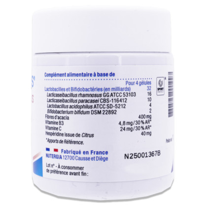 Nutergia, un laboratoire reconnu pour son expertise en micronutrition, propose une formule unique avec 4 souches vivantes de probiotiques dosées à 8 milliards par gélule. Ces souches, non microencapsulées, contribuent à l'équilibre de la flore intestinale. La vitamine B3 participe au maintien de muqueuses normales dont celle de l'intestin, tandis que la vitamine C soutient le fonctionnement normal du système immunitaire. Ces ingrédients actifs sont soigneusement sélectionnés pour leurs bienfaits sur l'organisme, en respectant les normes européennes en vigueur.
