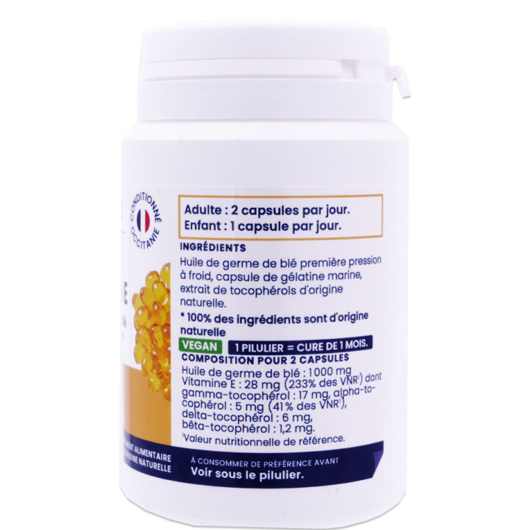 Ingrédients : Huile de germe de blé première pression à froid, capsule de gélatine marine, extrait de tocophérols d'origine naturelle. 100% des ingrédients sont d'origine naturelle.