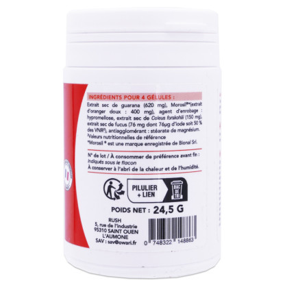 Ingrédients pour 4 gélules : Extrait sec de guarana, Morosil®*(extrait d’oranger doux : 400 mg), agent d’enrobage : hypromellose, extrait sec de Coleus forskolhii, extrait sec de fucus, antiagglomérant : stéarate de magnésium.