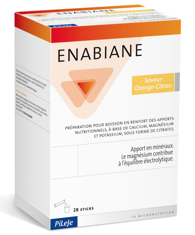 ENABIANE est un complément alimentaire en stick à diluer, composé de calcium, potassium et magnésium. Le magnésium contribue au métabolisme énergétique normal et au fonctionnement normal du système nerveux et de la fonction cognitive. Le potassium contribue au fonctionnement normal du système nerveux, au maintien d'une pression artérielle normale ainsi qu'à une fonction musculaire normale. Le calcium contribue à une fonction musculaire normale et au maintien du capital osseux et dentaire.