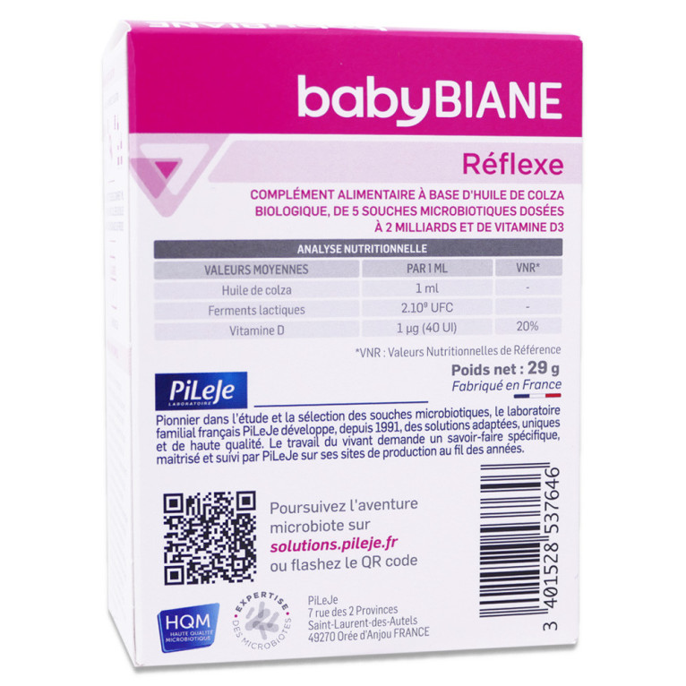 Ce complément alimentaire sous forme de compte-gouttes est à base de 5 souches microbiotiques (Bifidobacterium longum LA101, Lactobacillus helveticus LA102, Lactococcus lactis LA103, Streptococcus thermophilus LA104, Lactobacillus rhamnosus LA801) qui sont dosées à 2 milliards par comprimé, d’huile de colza et de vitamines D3. Les souches de BABY BIANE sont déposées et enregistrées dans les collections privées de l’Institut Pasteur.