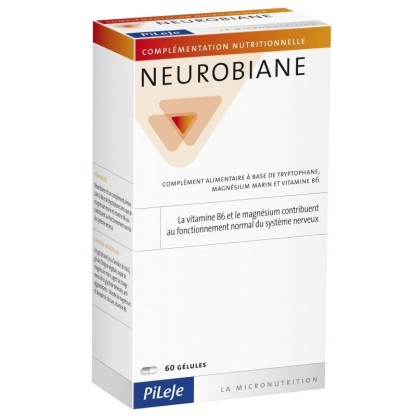 NEUROBIANE est spécialement formulé sous forme de gélules à base de magnésium marin et de vitamine B6 qui contribuent au fonctionnement normal du système nerveux. Le magnésium est un sel minéral qui participe à plus de trois cents réactions chimiques dans l’organisme. NEUROBIANE apporte 18% des valeurs nutritionnelles de référence en vitamine B6 et 15% de ces valeurs en magnésium par prise journalière d’une gélule. Ce complément alimentaire fabriqué en France contient 60 gélules et est également dosé en L-tryptophane, un acide aminé.