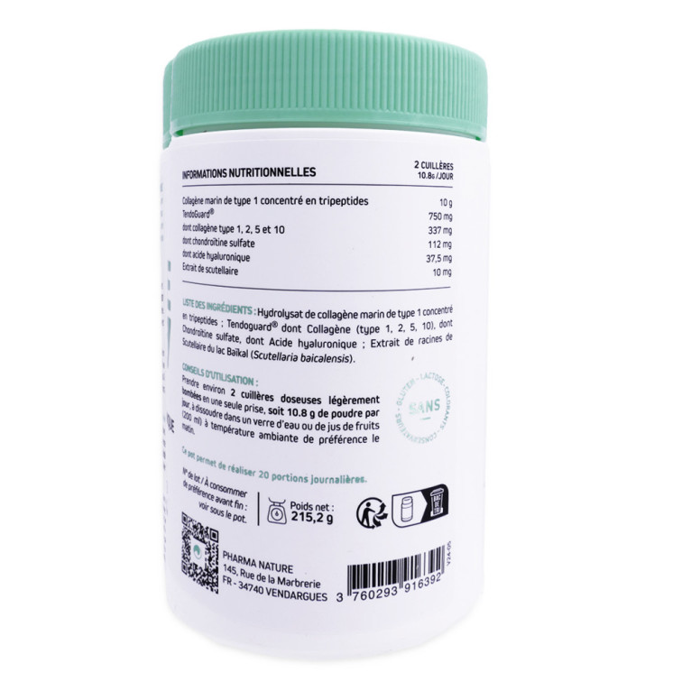 Composition pour 2 cuillères : Hydrolysat de collagène marin de type 1 concentré en tripeptides 750 mg ; Tendoguard® dont collagène (type 1, 2, 5, 10) 337 mg dont Chondroïtine sulfate 112 mg dont Acide hyaluronique 37,5mg ; Extrait de racines de Scutellaire du lac Baïkal (Scutellaria baicalensis) 10mg