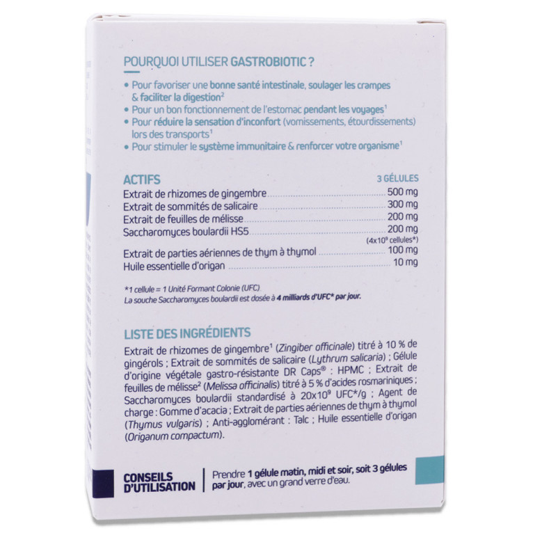 GASTROBIOTIC Confort digestif est un complément alimentaire sous forme de gélules qui contient des extraits de plantes et 4 milliards de ferments lactiques par gélule. Les gélules sont exemptes de nanoparticules et stéarate de magnésium.