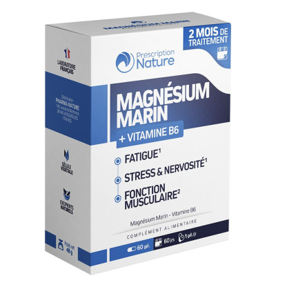 Magnésium Marin de Prescription Nature à prix discount, le complément alimentaire formulé avec du magnésium marin et de la vitamine B6 qui diminuent la fatigue et participe au fonctionnement normal du système nerveux dans votre parapharmacie en ligne discount.
