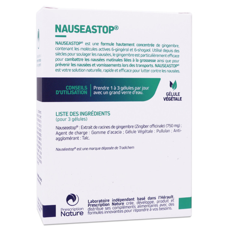 Nauseastop® : Extrait de racines de gingembre (Zingiber officinale) ● Agent de charge : Gomme d’acacia ● Gélule Végétale : Pullulan ● Anti- agglomérant : Talc.Pour 3 gélules : Nauseastop® : Extrait de racines de gingembre (Zingiber officinale) 750 mg. Nauséastop® est une marque déposée de Tradichem.