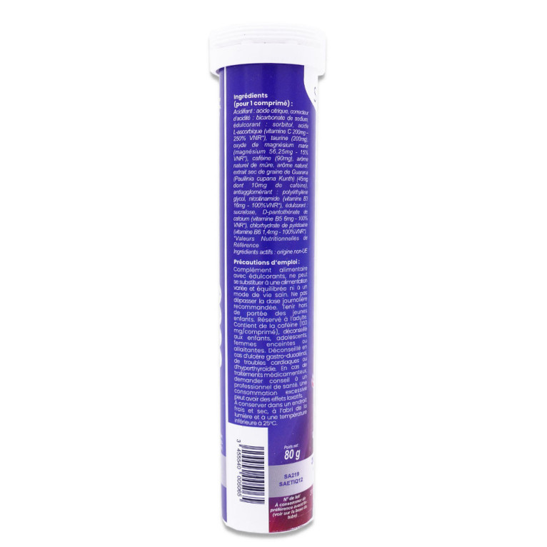 Ingrédients (pour 1 comprimé) : Acidifiant : acide citrique, correcteur d'acidité : bicarbonate de sodium, édulcorant : sorbitol, acide L-ascorbique (vitamine C 200 mg - 250 % VNR*), taurine (200 mg), oxyde de magnésium marin (magnésium 56,25 mg - 15 % VNR*), caféine (90 mg), arôme naturel de mûre, arôme naturel, extrait sec de graine de Guarana (Paullinia cupana Kunth) (45 mg dont 10 mg de caféine), antiagglomérant : polyéthylène glycol, nicotinamide (vitamine B3 16 mg - 100 % VNR*), édulcorant : sucralose, D-pantothénate de calcium (vitamine B5 6 mg - 100 % VNR*), chlorhydrate de pyridoxine (vitamine B6 1,4 mg - 100 % VNR*)*Valeurs Nutritionnelles de Référence