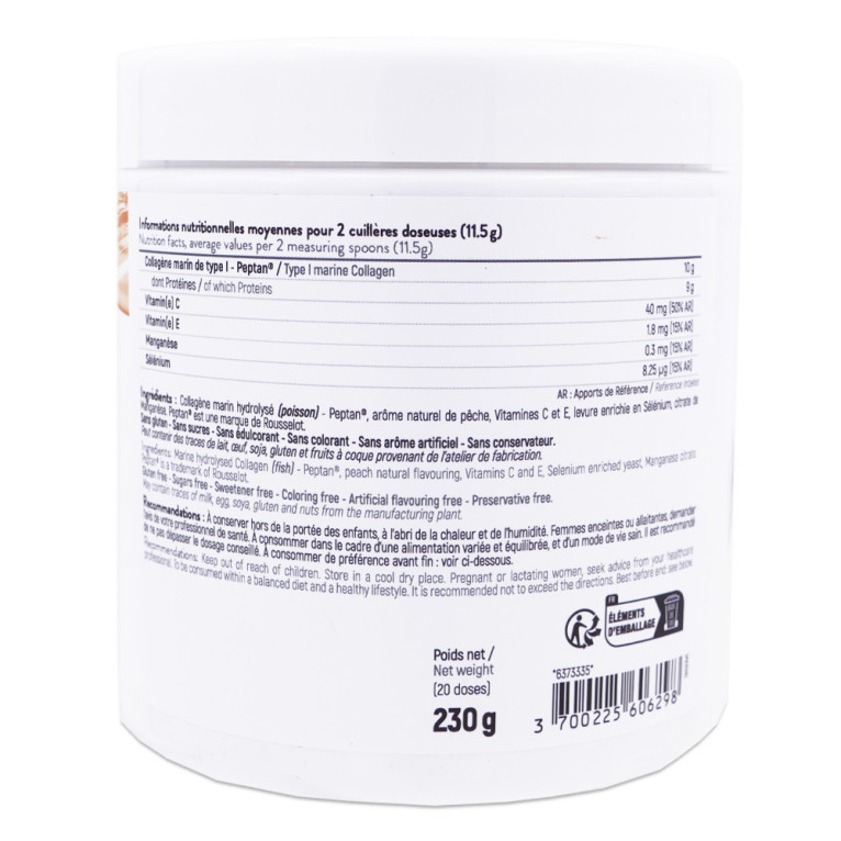 Collagène marin hydrolysé (poisson) - Peptan®, arôme naturel de pêche, Vitamines C et E, levure enrichie en Sélénium, citrate de Manganèse. Peptan® est une marque de Rousselot.