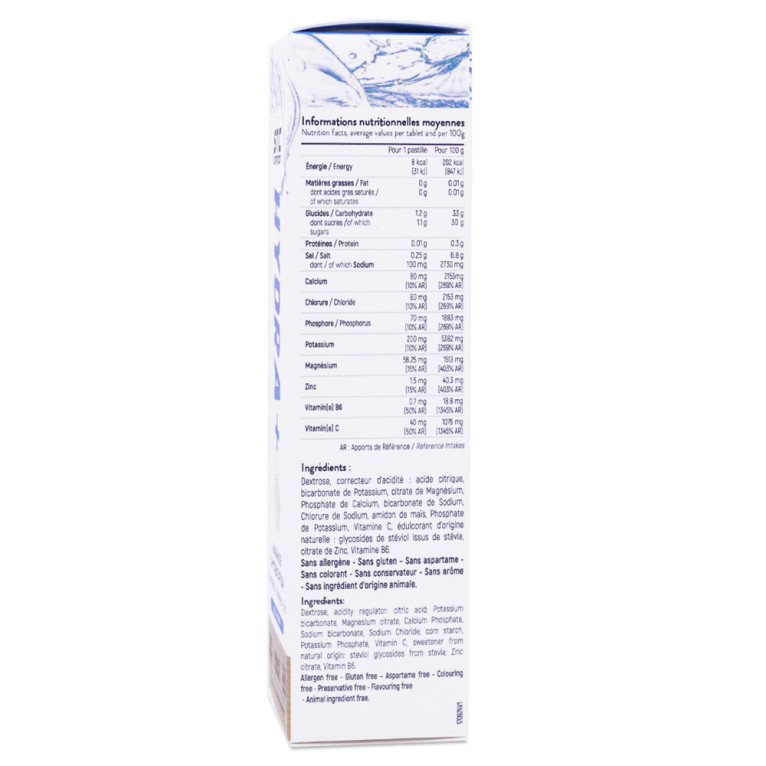 Dextrose, correcteur d’acidité : acide citrique, bicarbonate de Potassium, citrate de Magnésium, Phosphate de Calcium, bicarbonate de Sodium, Chlorure de Sodium, amidon de maïs, arômes naturels, Phosphate de Potassium, Vitamine C, édulcorant d’origine naturelle : glycosides de stéviol issus de stévia, citrate de Zinc, Vitamine B6