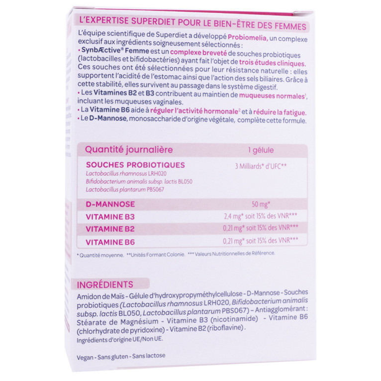 Superdiet propose avec Probiomelia Confort Intime une formule associant SynbÆctive® Femme, un complexe de 3 souches probiotiques brevetées apportant 3 milliards d’UFC par gélule, du D-Mannose ainsi que les vitamines B2, B3 et B6. Les probiotiques contribuent à l’équilibre de la flore intestinale, dans le cadre d’une hygiène de vie adaptée. Les vitamines B2 et B3 participent au maintien de muqueuses normales, tandis que la vitamine B6 contribue à réguler l'activité hormonale. Le D-Mannose complète cette association ciblée pour une prise quotidienne simple. Découvrez cette formule pratique et optez pour un complément alimentaire pensé pour accompagner votre confort intérieur au quotidien.