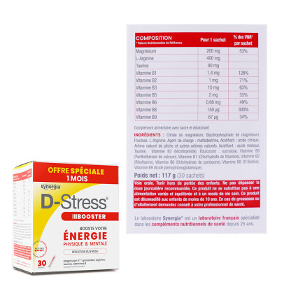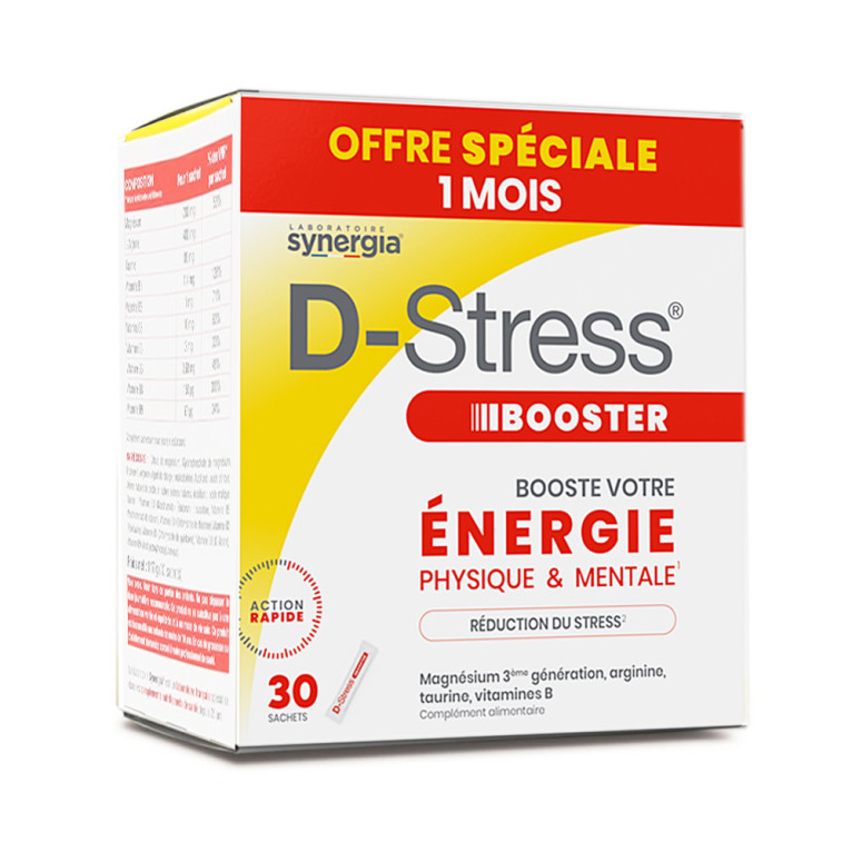 SYNERGIA D-STRESS BOOSTER 30 SACHETS est un complément alimentaire en vente en ligne, sur le site de votre parapharmacie à prix discount.
