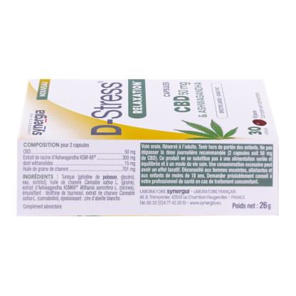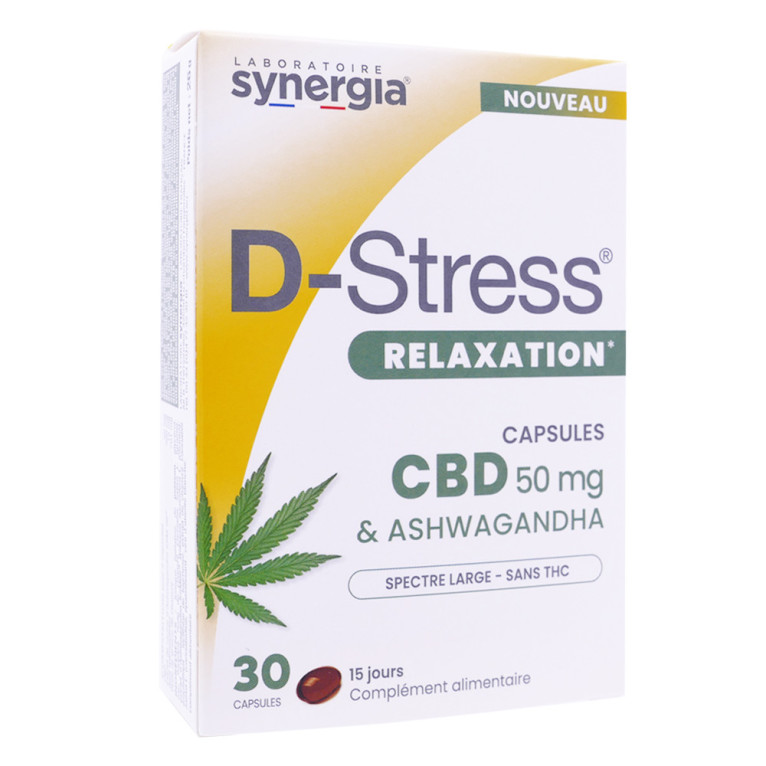 SYNERGIA D-STRESS RELAXATION CBD 50MG 30 CAPSULES : un allié naturel pour apaiser votre esprit, en vente en ligne sur le site de votre parapharmacie à prix discount. Découvrez une solution efficace pour gérer le stress au quotidien grâce à cette formule innovante.