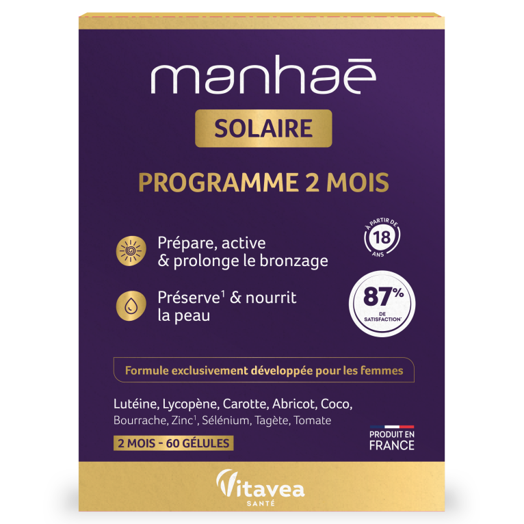 La formule de MANHAE Solaire est un complément alimentaire sous forme de gélules, composé d’extraits de plantes (carotte, abricot) à teneur naturelle de caroténoïdes, du sélénium et du zinc, associés à des pigments naturels. Le complexe d’extraits de plantes maintient un teint hâlé et lumineux et procure un effet bonne mine grâce aux pigments naturels (lutéine et lycopène). Le sélénium et le zinc contribuent à protéger les cellules contre le stress oxydatif. Attention : Ce complément alimentaire ne protège pas des coups de soleil, une protection solaire adaptée au type de peau et des lunettes de soleil sont indispensables lors de l'exposition au soleil