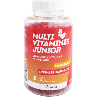 Multi Vitamines Junior VITAVEA SANTE des laboratoires NUTRISANTE conditionné sous forme de gummies, est composé de 9 Vitamines, et minéraux. La vitamine D participe à la croissance et au développement osseux normaux, et au fonctionnement normal du système immunitaire des enfants. Aromatisés à la cerise, les enfants prendront facilement les gummies !