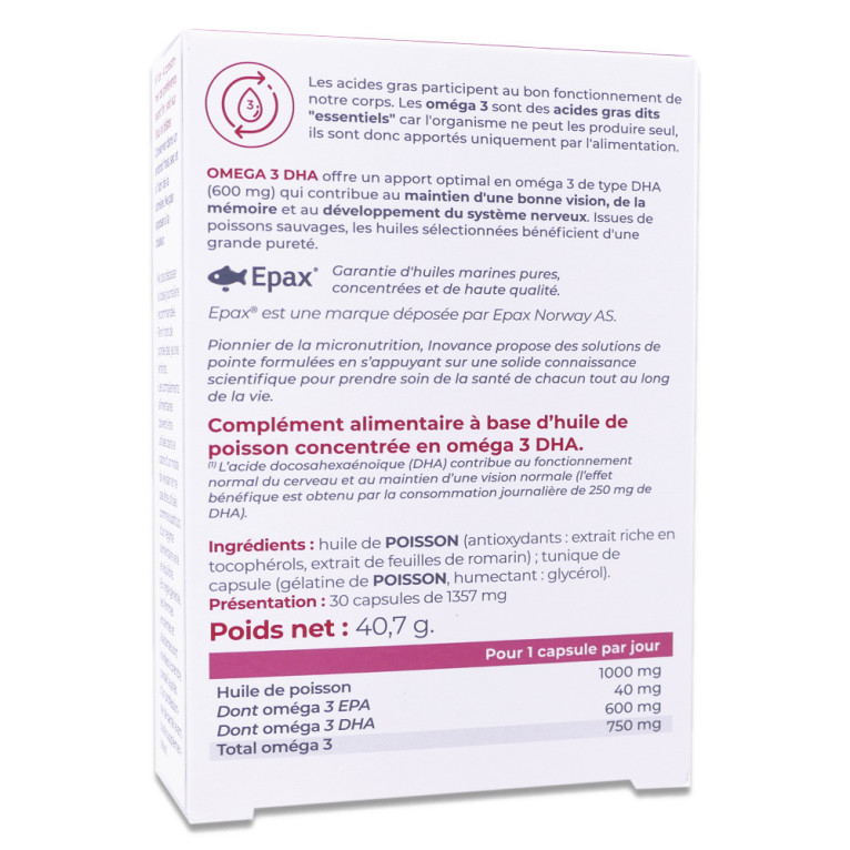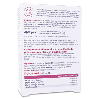Pour 1 capsule par jour : Huile de poisson : 1000 mg, dont EPA : 40 mg, dont DHA : 600 mg. Total OMEGA 3 : 750 mg