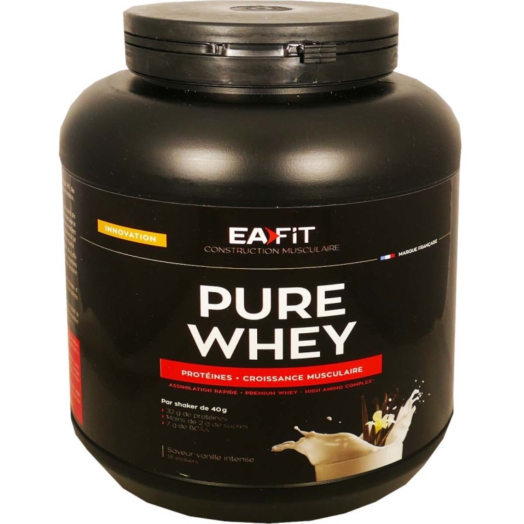 Pure Whey Croissance Musculaire d'EAFIT Construction Musculaire , un complément alimentaire, sous forme de poudre à diluer, composé de vitamines et d’acides aminés, saveur vanille intense, dans votre parapharmacie en ligne à prix discount.