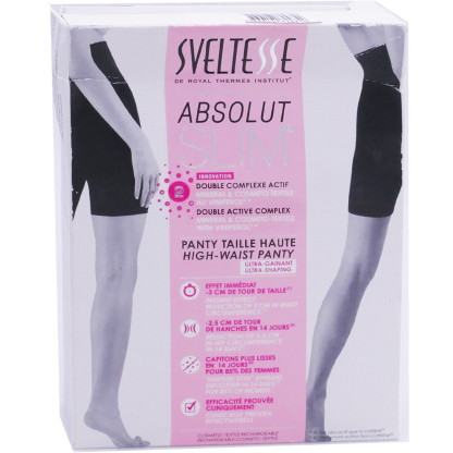 Sveltesse absolut slim est la solution idéale pour affiner la silhouette, lisser la peau d’orange et raffermir la peau. Sous forme d’un Panty à enfiler, invisible sous les vêtements, Sveltesse absolut slim gaine immédiatement la silhouette. Mais il offre également une action amincissante renforcée grâce à ses fibres «Cosmeto-Textile» qui assurent un micro-massage et une diffusion permanente d’actifs amincissants microencapsulés à base de caféine, par principe de chrono-libération. Souple et doux au toucher, Sveltesse absolut slim s’entretient très facilement et sèche rapidement. Il est rechargeable tous les trois lavages grâce aux recharges Actifs Minceur que l’on ajoute à la dernière eau de rinçage. Résultat en 4 semaines : jusqu’à moins 3 cm de tour de cuisse, 2 cm de tour de hanche, 3 cm de tour de taille, une peau plus ferme, plus lisse et une silhouette visiblement affinée.