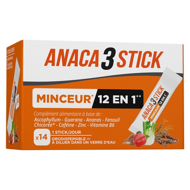 Anaca 3 Stick Minceur 12 en 1 est un complément alimentaire conditionné en sticks orodispersibles, qui va grâce à 4 plantes (chicorée, guarana, fenouil, ascophyllum), caféine, vitamine et zinc, agir sur des actions minceurs : il facilite la digestion, et aide à limiter les inconforts digestifs (comme les ballonnements) grâce à l'action du fenouil ; il contribue aux fonctions normales d’élimination urinaire, au soutien des systèmes de détoxification et des programmes d’amincissement grâce à la chicorée, et aide à augmenter les dépenses énergétiques, ainsi qu’à la combustion des graisses grâce au guarana. Anaca 3 Stick Minceur 12 en 1 contient également du zinc qui contribue au métabolisme normal des macronutriments et de la vitamine B6 qui contribue à réduire la fatigue. L’ascophyllum et la caféine complètent la formule.