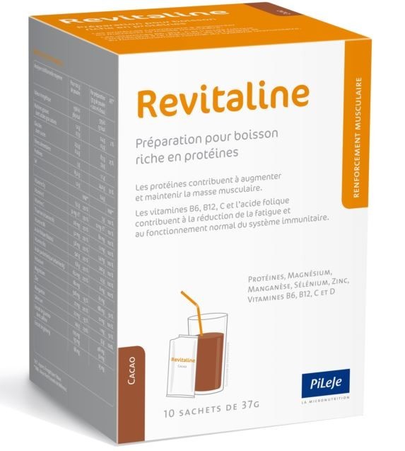 REVITALINE Renforcement Musculaire du laboratoire PILEJE à prix discount, en vente dans votre parapharmacie en ligne discount, une préparation pour boisson au cacao conçue à partir de protéines qui contribuent à augmenter et maintenir la masse musculaire.