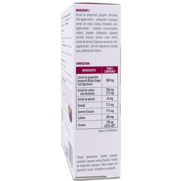 Composition pour 2 comprimés : Extrait de gingembre fermeté (Black Ginger Full Spectrum) : 300 mg ; Extrait de coleus (dont sorskoline) : 250 mg (27,5 mg) ; Extrait de piment : 45 mg ; Baobab : 112 mg ; Gomme d'acacia : 112 mg ; Caféine : 200 mg ; chrome : 250 µg (625% AR*). *Apport de référence