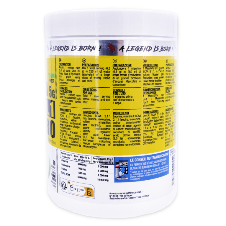 Composition : BCAA (leucine, isoleucine, valine) ; agent de charge : maltodextrine ; régulateur d’acidité : acide citrique ; arôme ; édulcorant : sucralose ; émulsifiant : lécithine de soja ; colorant : bleu brillant fcf, tartrazine.