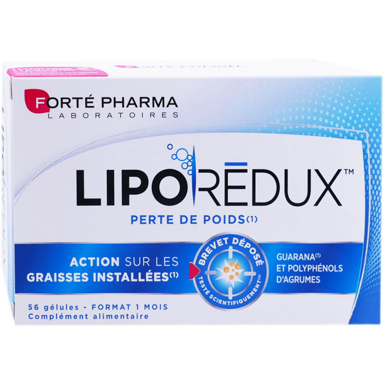 LIPOREDUX Perte de poids de FORTÉ PHARMA est un complément alimentaire conditionné sous forme de gélules. La formule innovante de LIPOREDUX associe un complexe breveté riche en extraits secs d'agrumes et en guarana : le SINETROL. Le guarana aide à combattre les excès de poids et facilite la perte de poids en complément d'un régime minceur. Le zinc contribue au métabolisme des acides gras et le chrome contribue au maintien d'une glycémie normale.