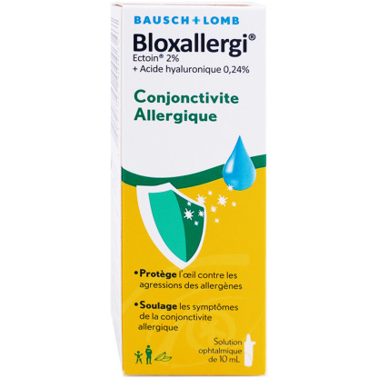 BLOXALLERGI du laboratoire BAUSCH + LOMB est une solution ophtalmique composée d’ectoin et acide hyaluronique. L’ectoin est une molécule protectrice pour apaiser l’œil instantanément les inflammations, pour lui redonner tout son confort et protéger la surface de l’œil des allergènes (pollen, poils d’animaux, etc.). L’acide hyaluronique lubrifiant et apaisant, lubrifie l’œil pour longtemps et ainsi réduit les inconforts de l’allergie.