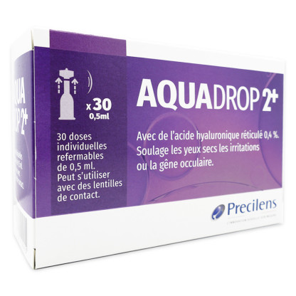 AQUADROP 2+ discount des laboratoires PRECILENS, la solution ophtalmique dans votre parapharmacie en ligne à prix discount, pour hydrater les lentilles souples et rigide, pour une pose et un retrait facile des lentilles.