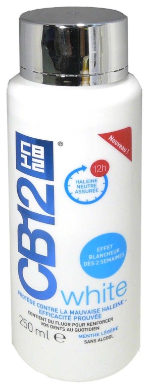 La gamme CB12 du laboratoire OMEGA PHARMA est composée de bains de bouche pour combattre la mauvaise haleine et maintenir une haleine fraîche. Le bain de bouche CB12 WHITE élimine les composés sulfurés volatils qui sont la cause de l’haltose (mauvaise haleine), blanchit les dents pour retrouver une blancheur naturelle en éliminant les taches de coloration et en luttant contre leur réapparition, et renforce les dents pour protéger des caries grâce à sa formule scientifiquement prouvé ainsi qu’au fluorure. Dès le premier bain de bouche et pendant 12 heures l’haleine est fraîche et légèrement mentholée. En seulement 2 semaines les dents retrouvent une blancheur éclatante ! Sans alcool