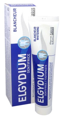 La marque ELGYDIUM des laboratoires Pierre Fabre est spécialisée dans les produits d’hygiène bucco-dentaire (dentifrice, brosse à dents, soins…) destiné à toute la famille Le dentifrice Blancheur composé de chlorhexidine et de bicarbonate de sodium micropulvérisé, agit sur la protection et la blancheur des dents. Il élimine les taches sur l’émail causés par le thé, le café, le tabac…, ainsi que le tartre et les bactéries, et lutte contre leur réapparition, polit tout en douceur et en profondeur même dans les sillons les plus fins de l’émail, et protège de l’apparition de caries. Aromatisé à la menthe, l’haleine sera fraîche. Les dents sont protégées et retrouvent une blancheur incomparable !