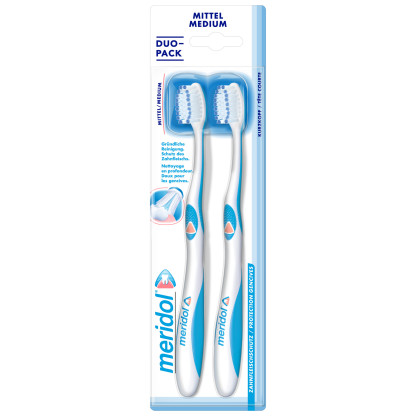 Duo de Brosse à dents Médium discount de MERIDOL, la brosse à dents qui nettoie efficacement et tout en douceur les dents et les gencives sensibles, dans votre parapharmacie en ligne à prix discount.