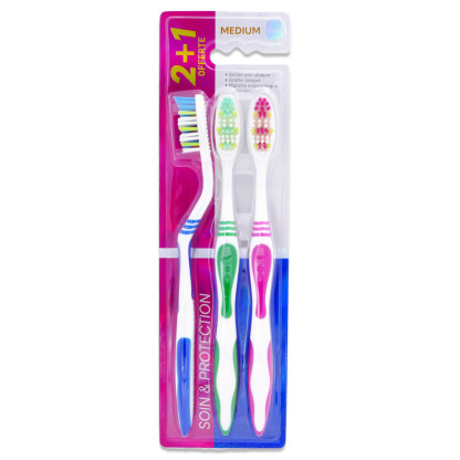 La marque Pharmascience Santé propose une brosse à dents avec une texture de poils medium, conçue pour assurer un nettoyage efficace tout en étant douce pour les gencives. Les poils de la brosse, fabriqués avec des matériaux de qualité, permettent d'éliminer les résidus alimentaires et d'assurer une hygiène buccale optimale. Ce coffret comprend trois brosses à dents : deux brosses à dents medium pour un usage régulier, et une troisième brosse offerte pour prolonger la durée d'utilisation.