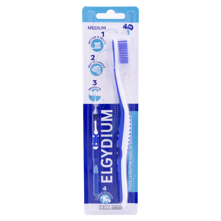ELGYDIUM BROSSE A DENTS MEDIUM 4 EN 1, la solution idéale pour une hygiène bucco-dentaire complète, est en vente en ligne sur le site de votre parapharmacie à prix discount.