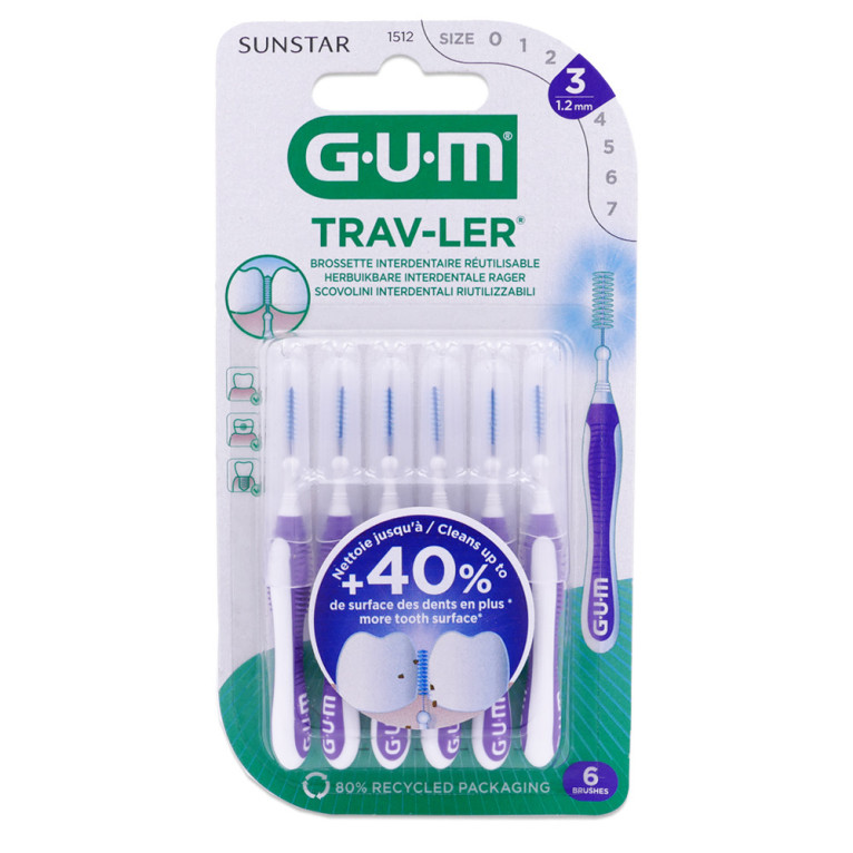 Les brossettes interdentaires GUM Travler, des soins professionnels pour des gencives en bonne santé une réduction optimale de la plaque dentaire. Taille 1,2 mm.