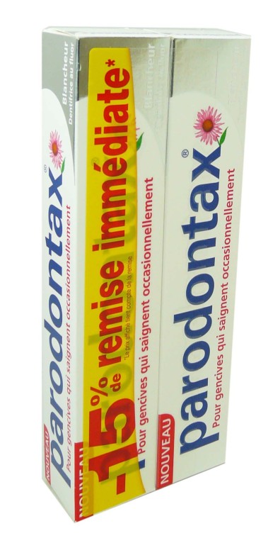 La gamme PARODONTAX du laboratoire GSK (GlaxoSmithKline ou Santé Grand Public) est composée de produits d’hygiène bucco-dentaire : dentifrices, bains de bouches.Le dentifrice composé de bicarbonate de sodium, de sels minéraux, d’actifs végétaux et de fluor, nettoie les dents en profondeur tout en douceur, élimine les taches et la plaque dentaire, lutte contre l’apparition des caries, protège les gencives sensibles en les renforçant et diminuent les saignements.Jour après jour, les gencives sont plus fortes et les dents retrouvent leur blancheur. Son goût à la Menthe, Myrrhe, Camomille, Echinacée, Sels minéraux, Ratanhia, Sauge, laissera l’haleine fraîche pour longtemps.