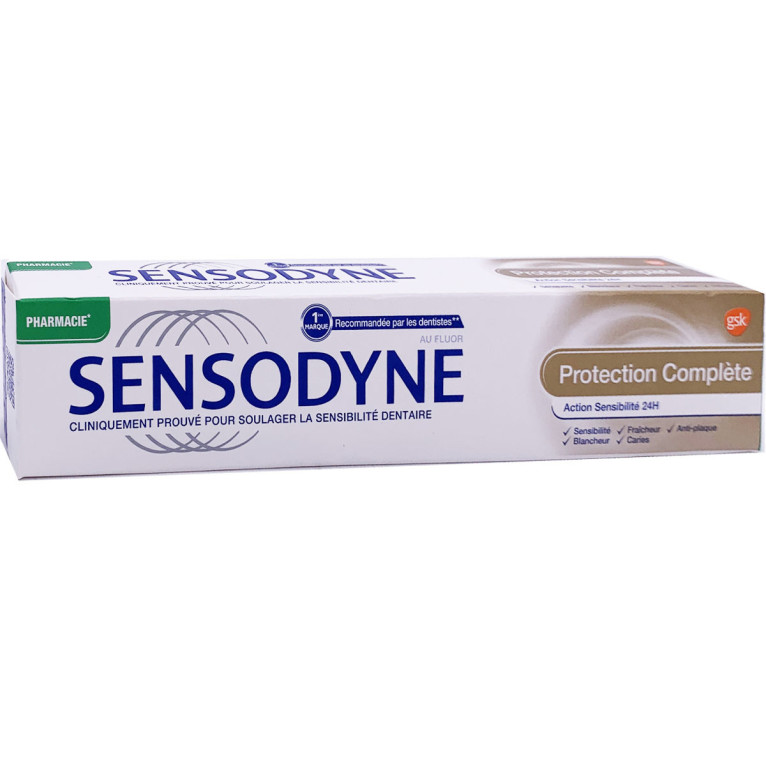 Le laboratoire SENSODYNE conçoit des produits d’hygiène bucco-dentaire pour protéger et soulager les dents sensibles au quotidien. Le dentifrice Protection complète composé de sel de potassium, du fluor et de citrate de zinc qui est un agent antibactérien, agit sur la protection et la sensibilité des dents et des gencives. Il élimine la plaque dentaire, protège l’émail de la formation de la plaque dentaire et de la sensibilité en formant une barrière protectrice sur les dents, reminéralise l’émail, renforce les gencives et apaise de la sensibilité. Au goût d’eucalyptus, le dentifrice rafraîchira l’haleine. Les dents sont protégées et renforcées.