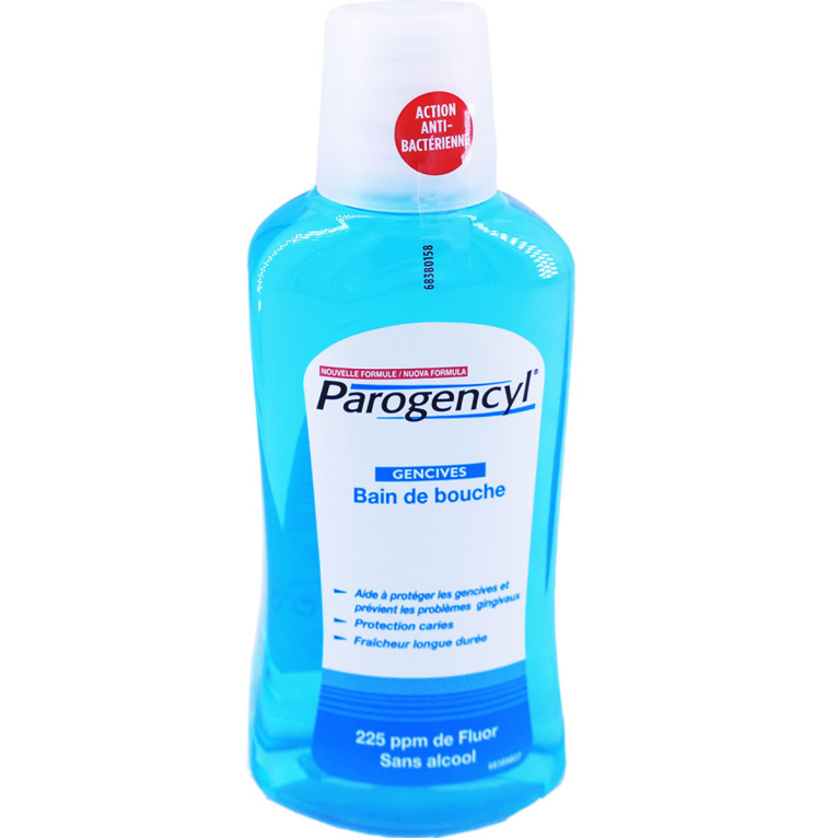 Le Bain de bouche Gencives PAROGENCYL associe une formule aux propriétés antibactériennes et du Fluor, pour lutter efficacement contre la plaque dentaire, prévenir la formation des caries, renforcer l’émail, et réduire les risques d’inflammation gingivale. Aromatisé à la menthe, la bouche sera fraîche. Sans alcool, le bain de bouche est un bon complément au brossage pour éliminer tous les résidus dans les espaces interdentaires.